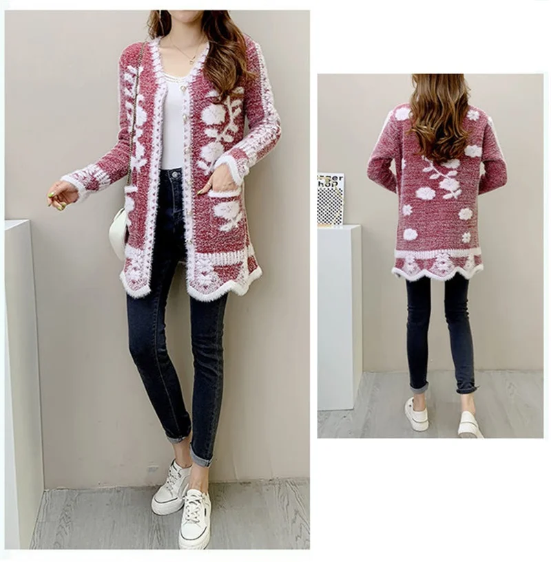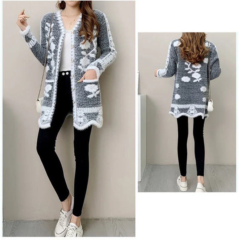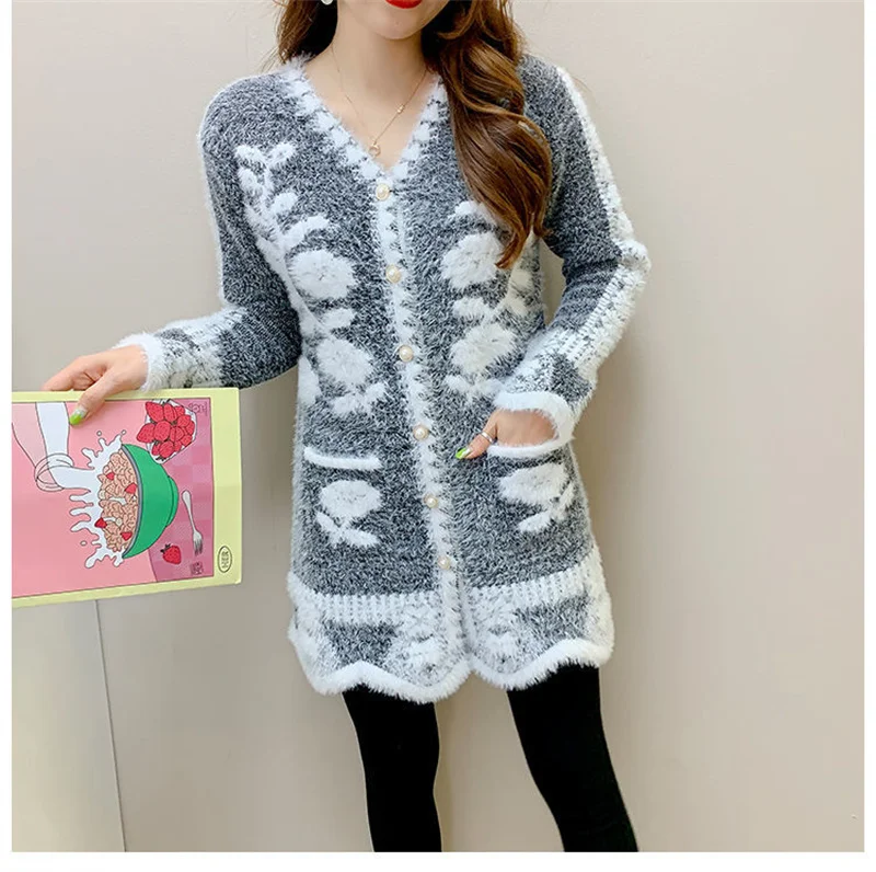 2025 New Winter Women’s Mid-Length Knitted Cardigan – Button-Up Slim Fit Imitation Mink Sweater Coat