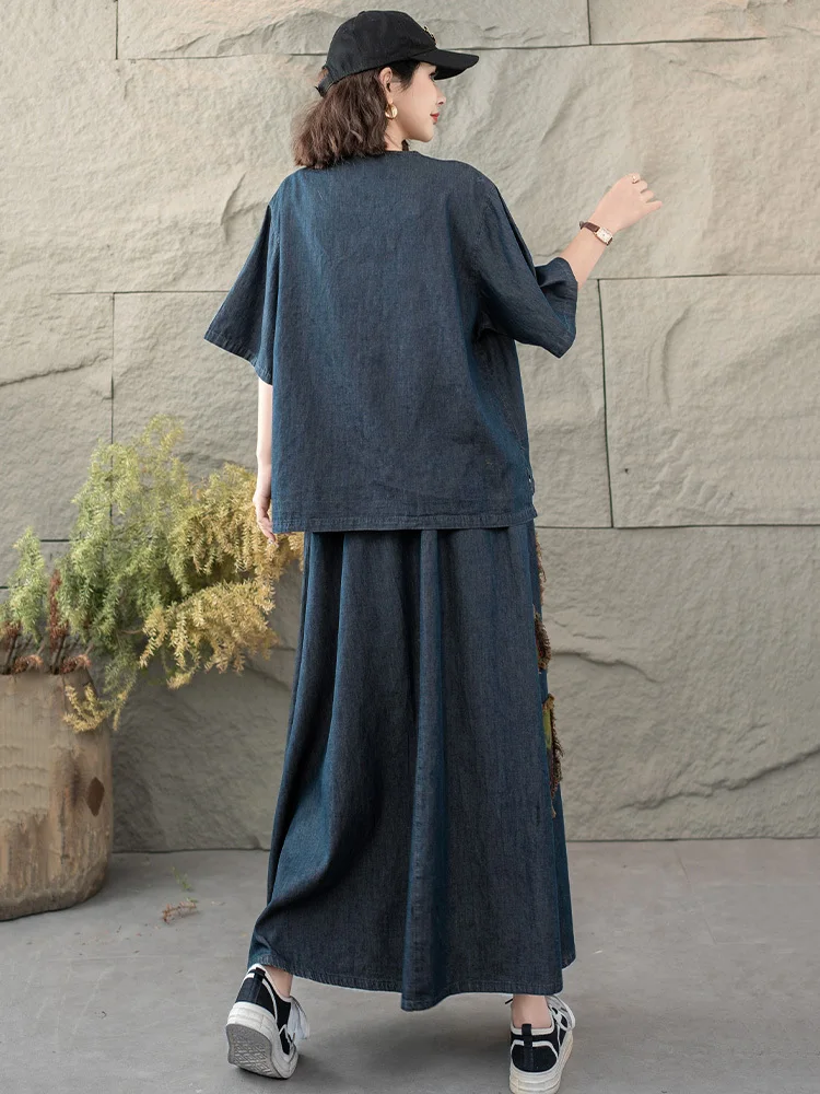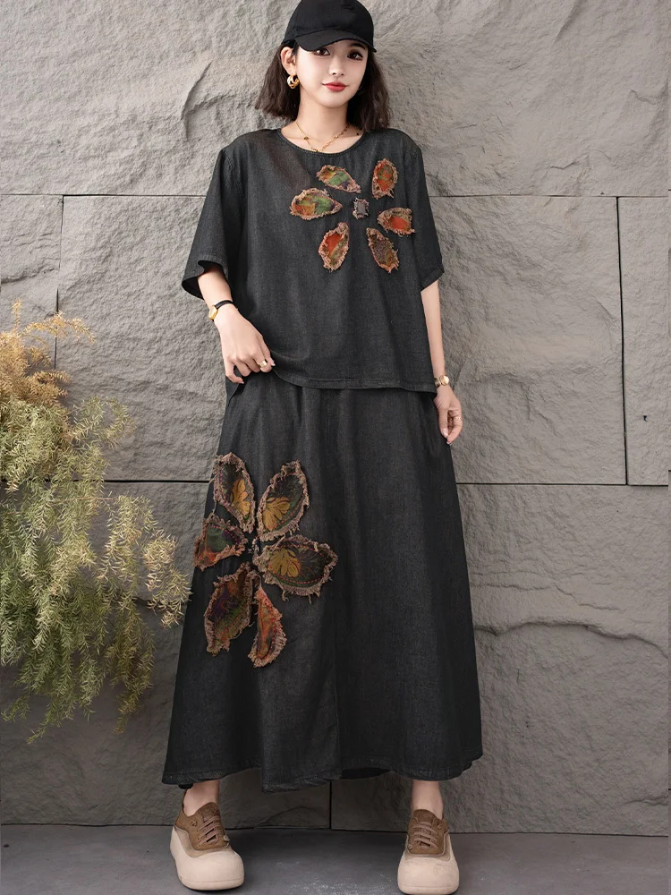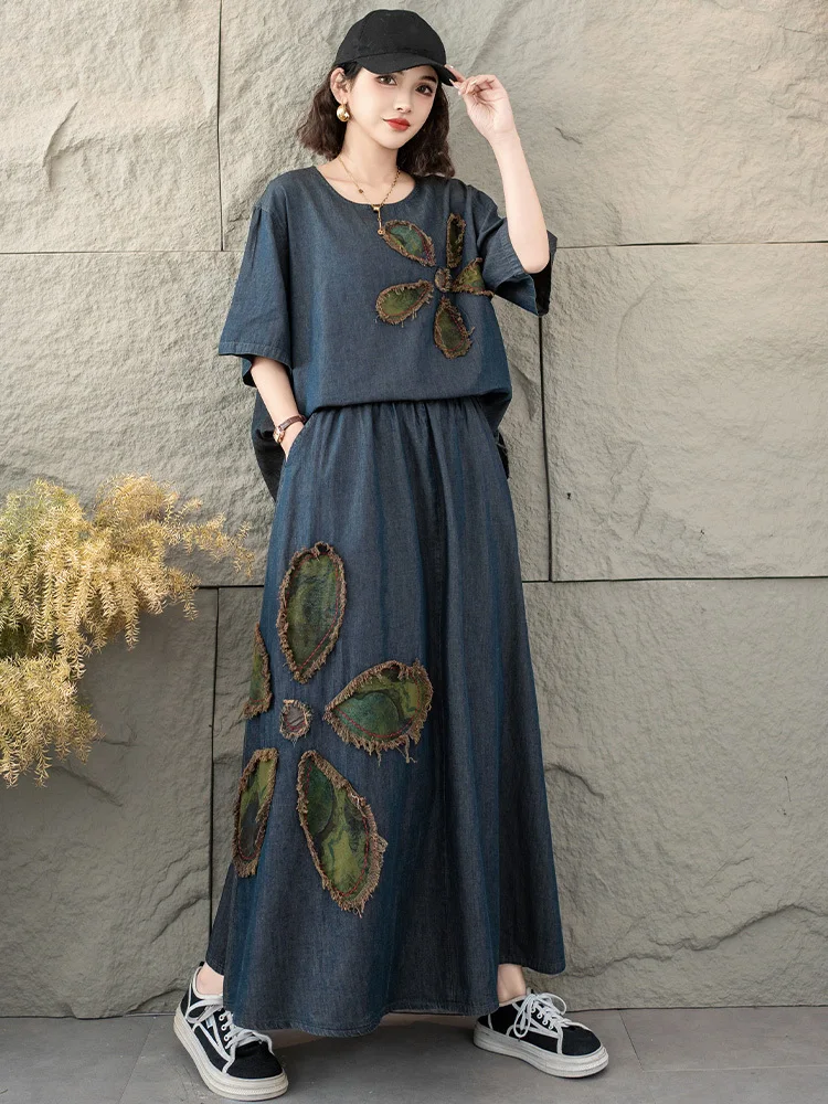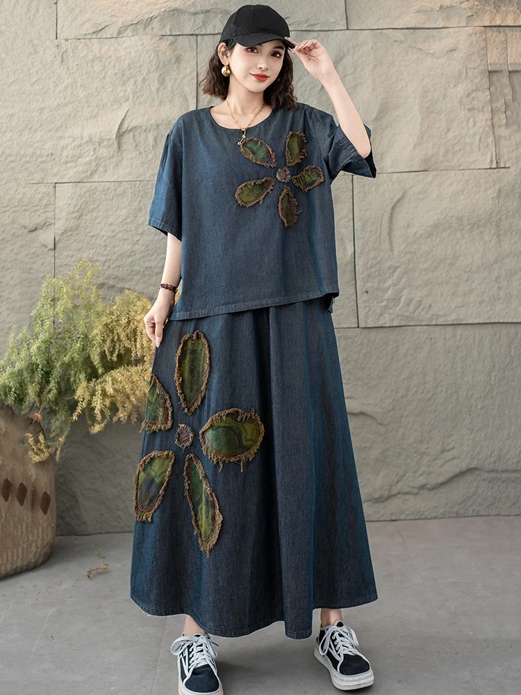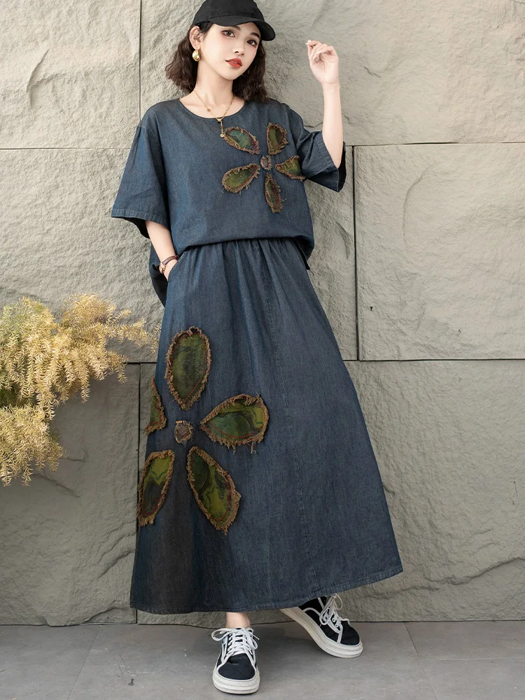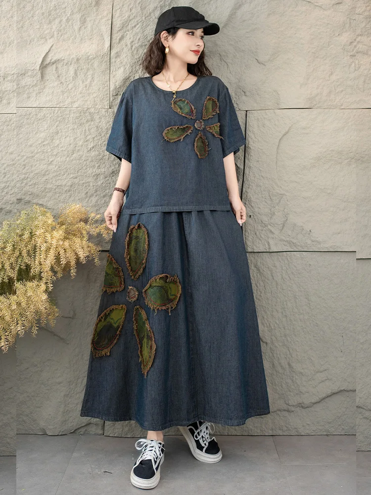 AmaxluluE 2025 Fashion Summer Women Printed Denim Skirt Suits Loose Two Pieces Sets Casual Tshirts Vintage Floral Elegant Outfit