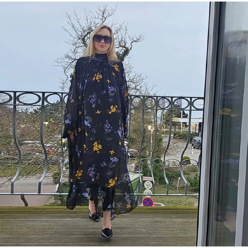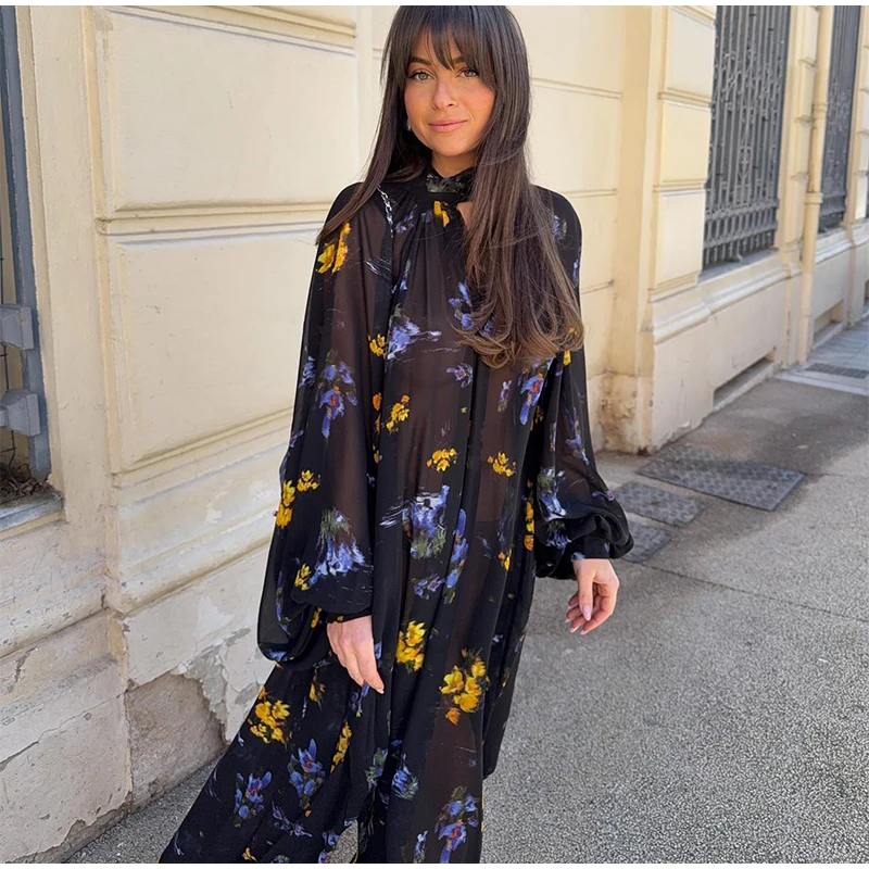 Elegant Printed Boho Long Dress – Women’s Loose Turtleneck Lantern Sleeve Floral Robes, 2025 Spring Summer Vacation Dress