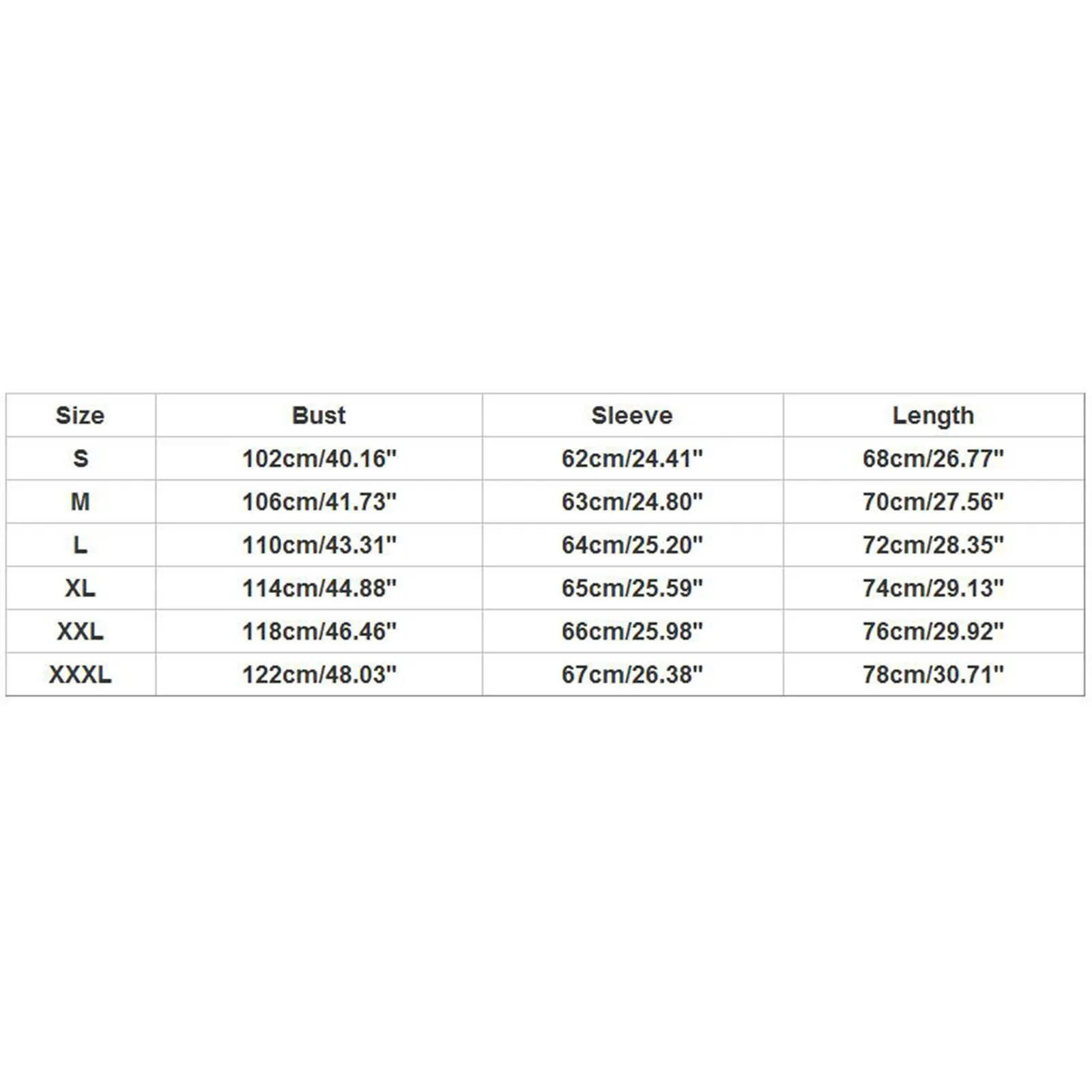Size:XXLBust:118-130cm/46.46-51.18”Sleeve:66cm/25.98”Length:76cm/29.92”