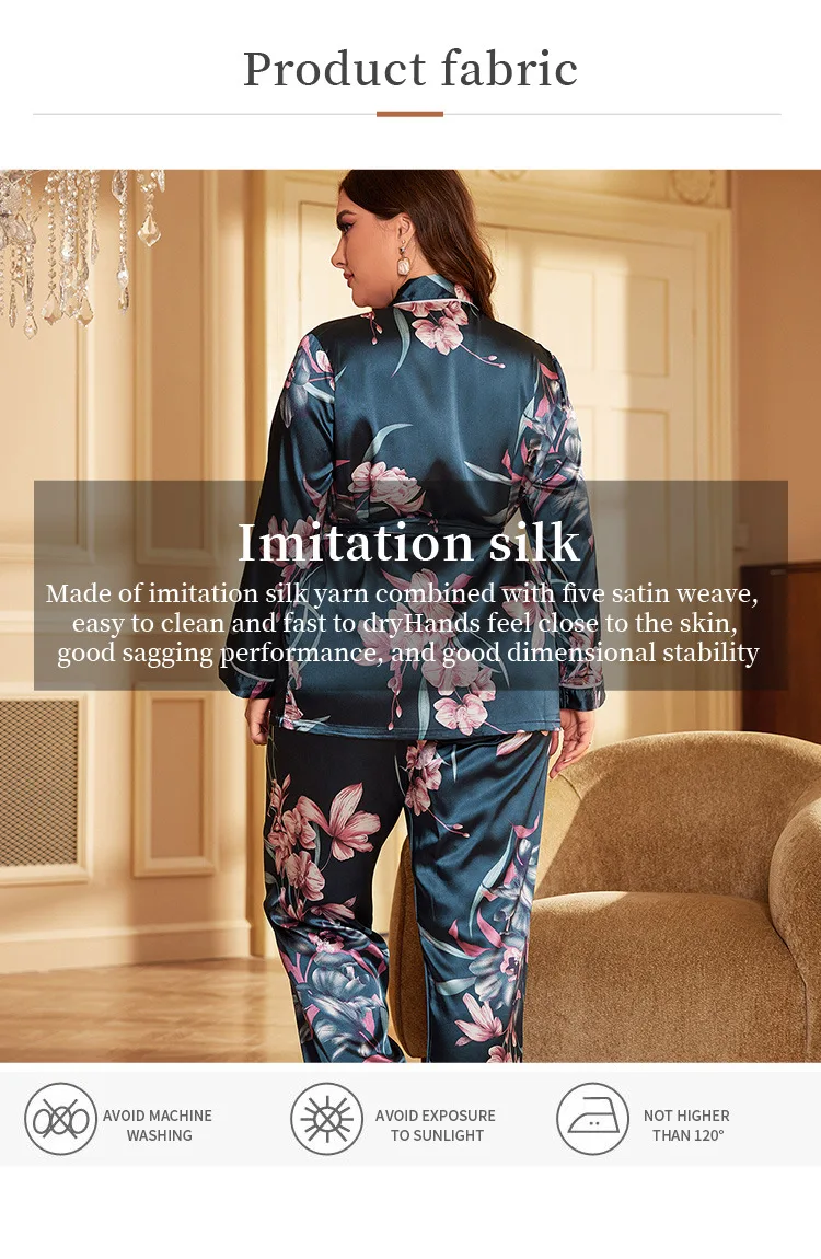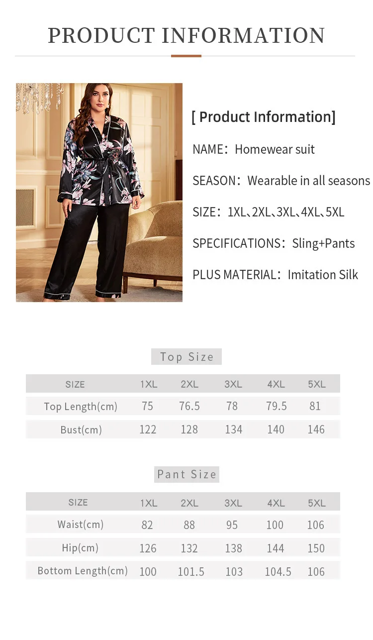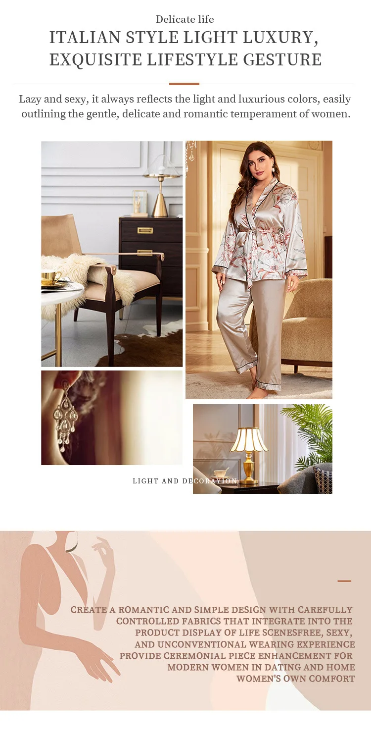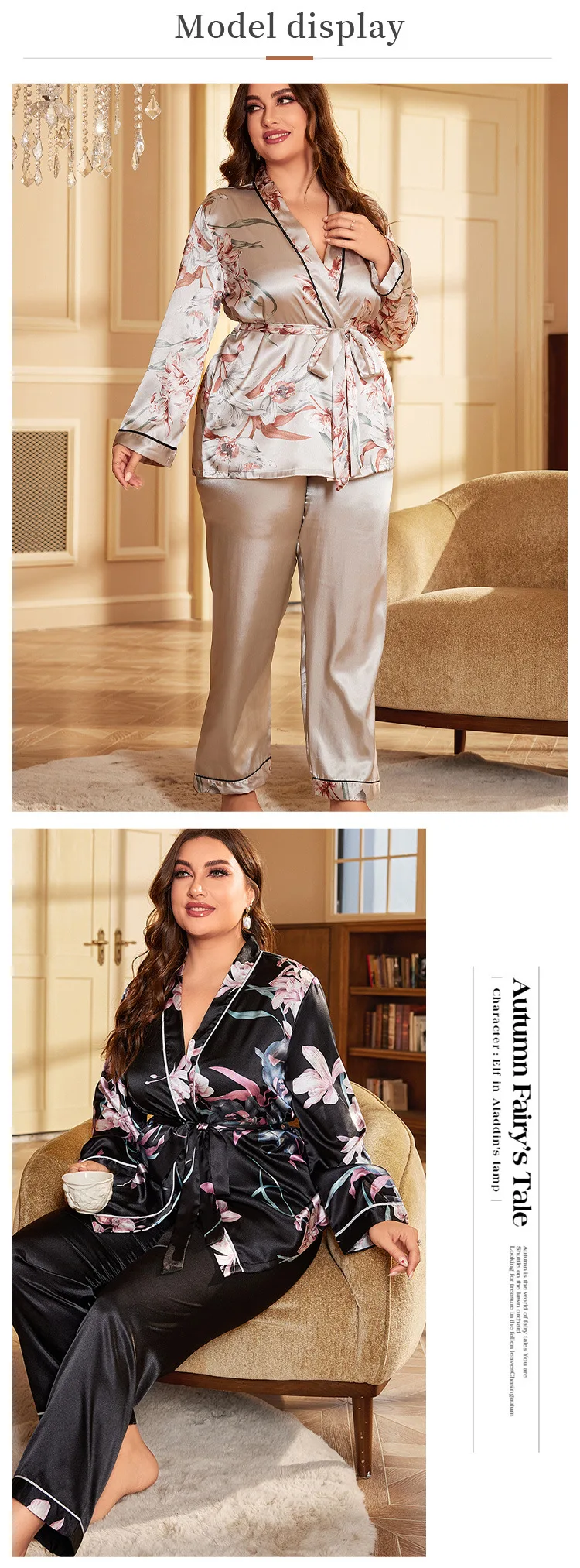 Silk Satin Women Pajama Set Floral Long Sleeve Top Robe & Full-Length Pants Lace-Up 2 Piece Sleepwear Nightwear Homwear