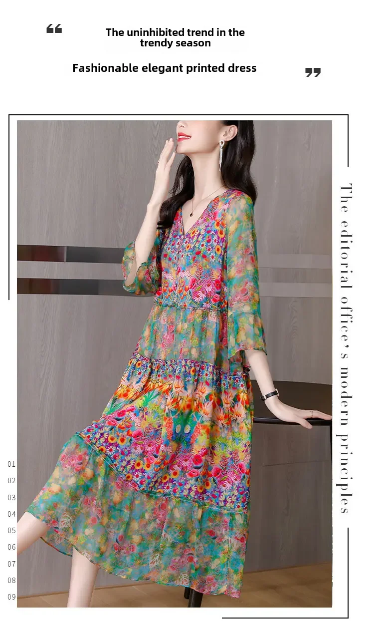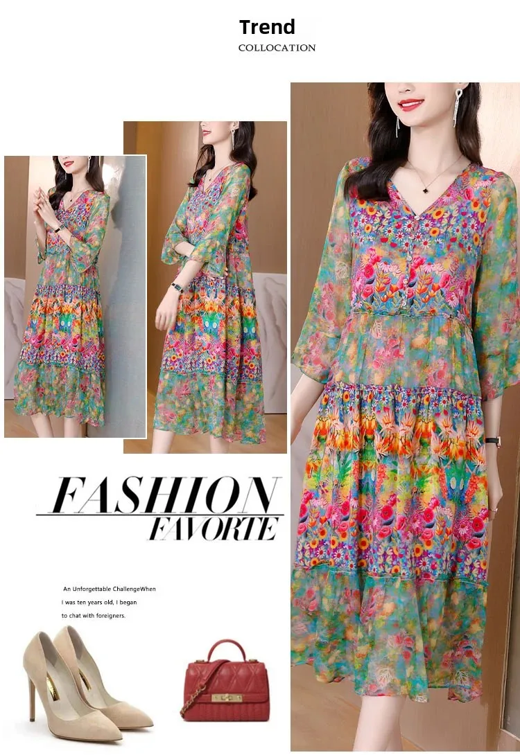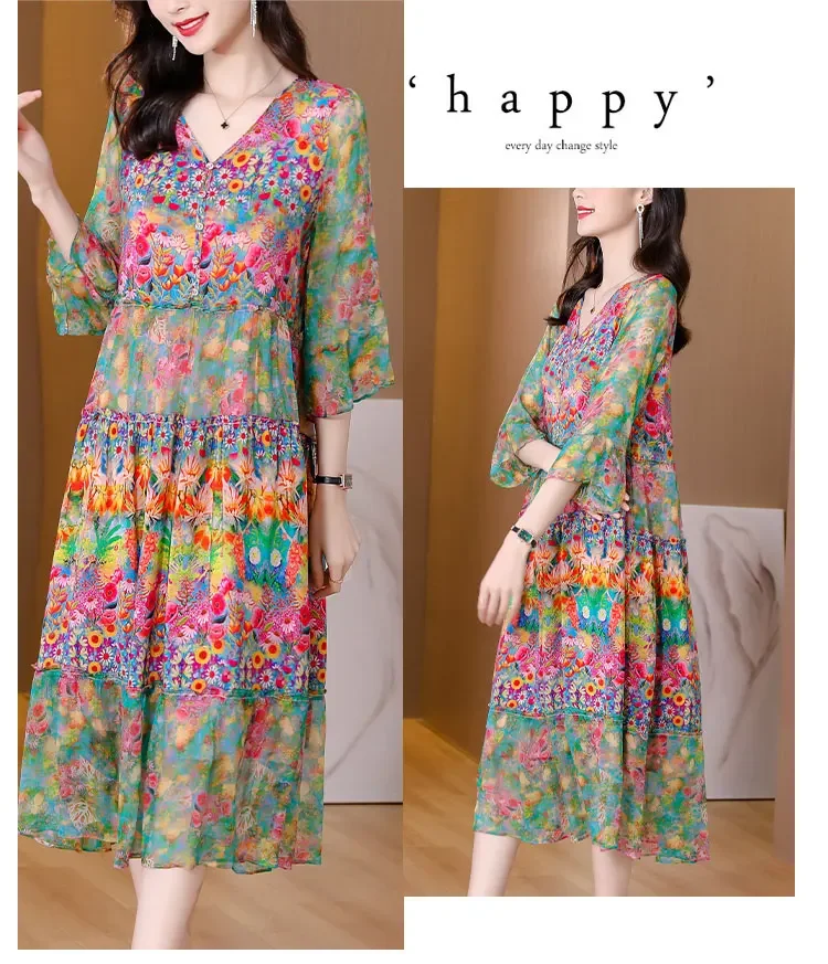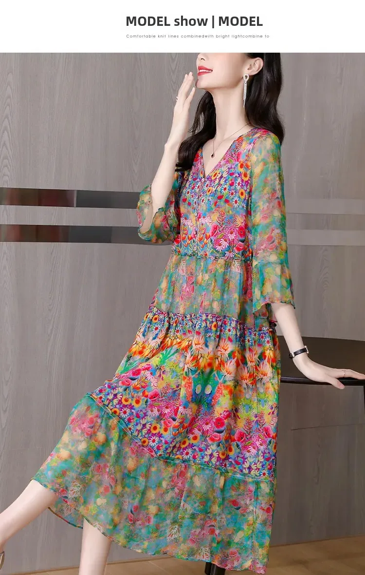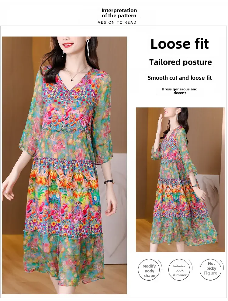 Women’s Genuine Mulberry Silk Long Dress – Loose Fit Printed Elegant Spring Outfit