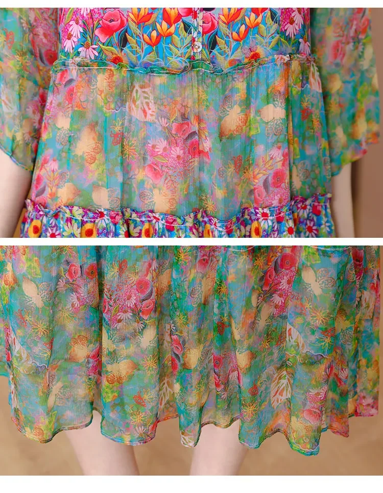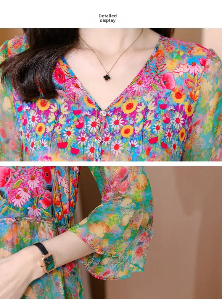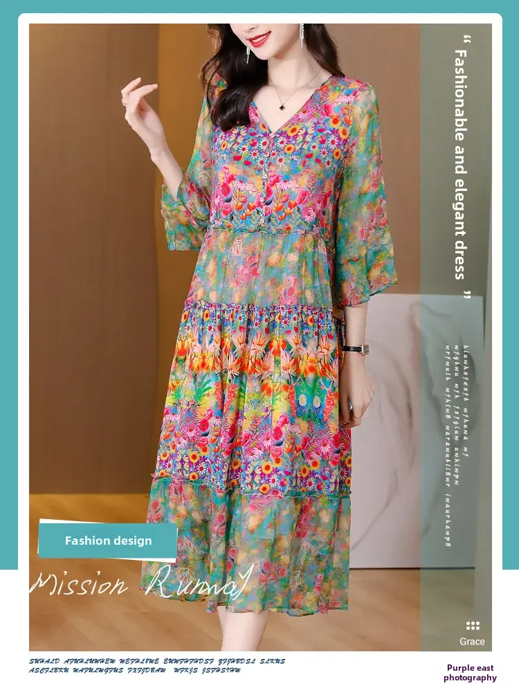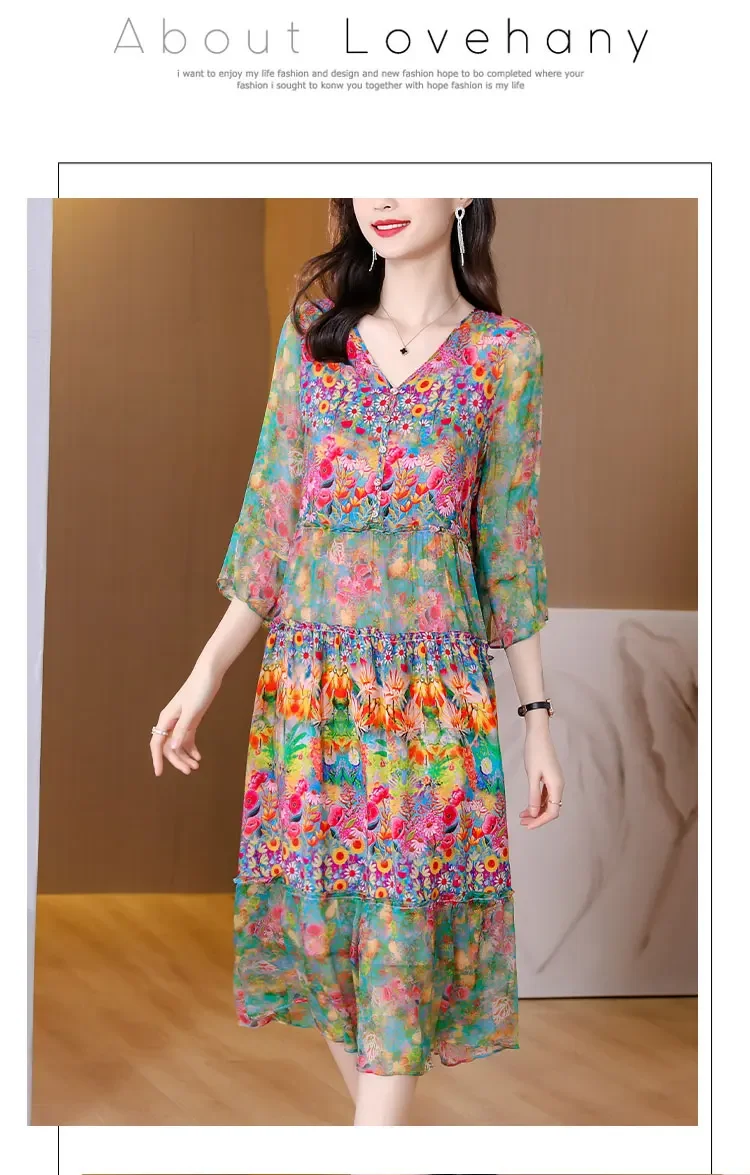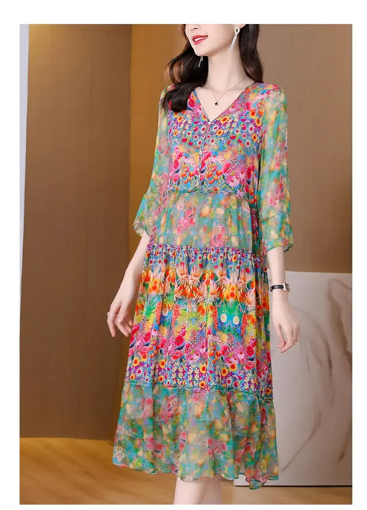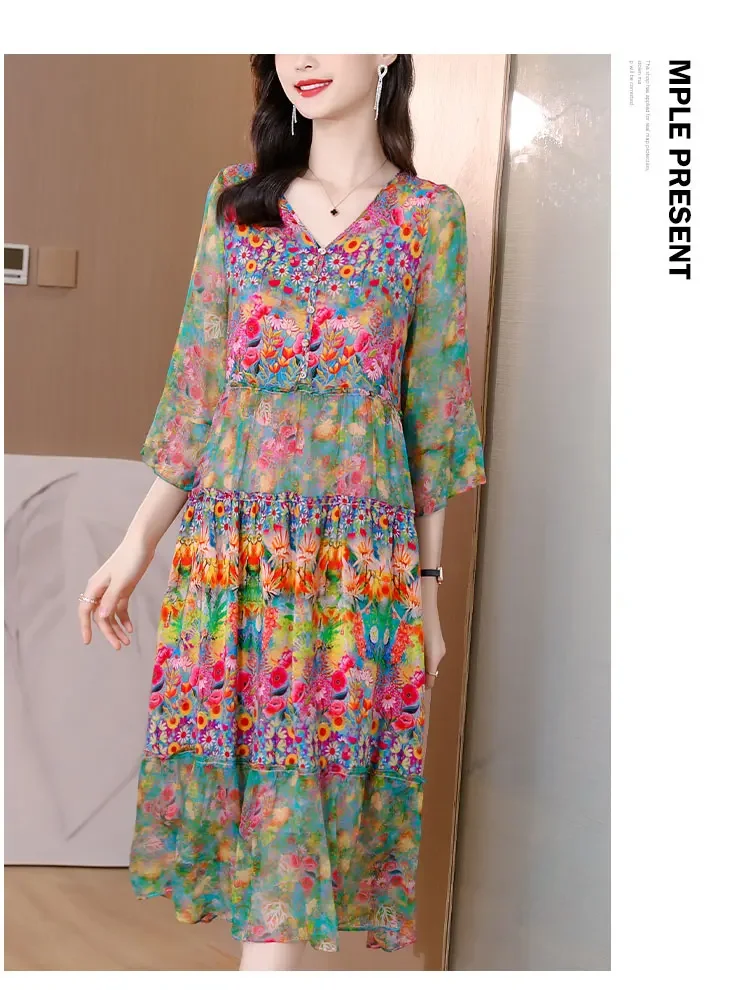 Women’s Genuine Mulberry Silk Long Dress – Loose Fit Printed Elegant Spring Outfit