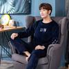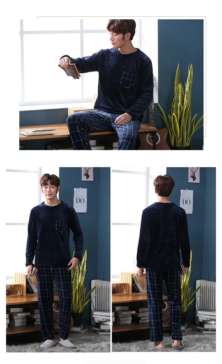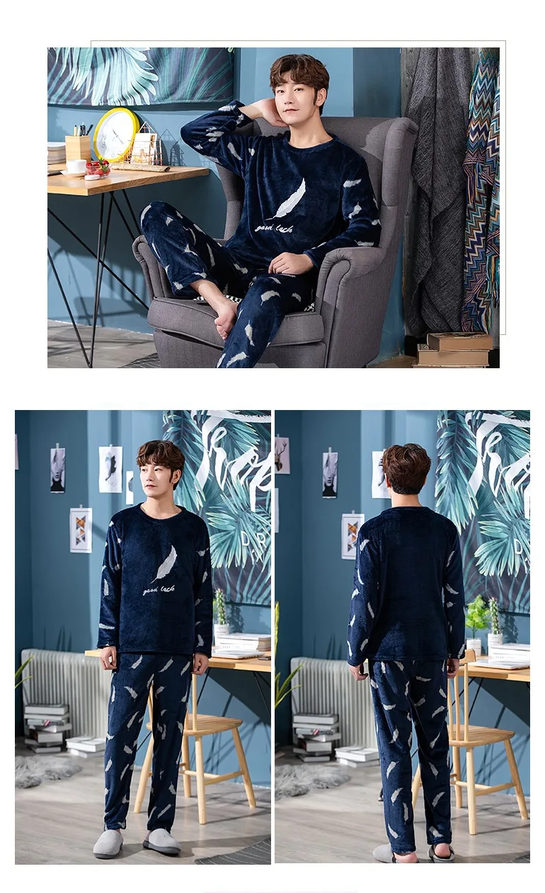 Men’s Winter Flannel 2-Piece Lounge Set – Thickened Round Neck Top & Long Sleeve Printed Loungewear Outfit