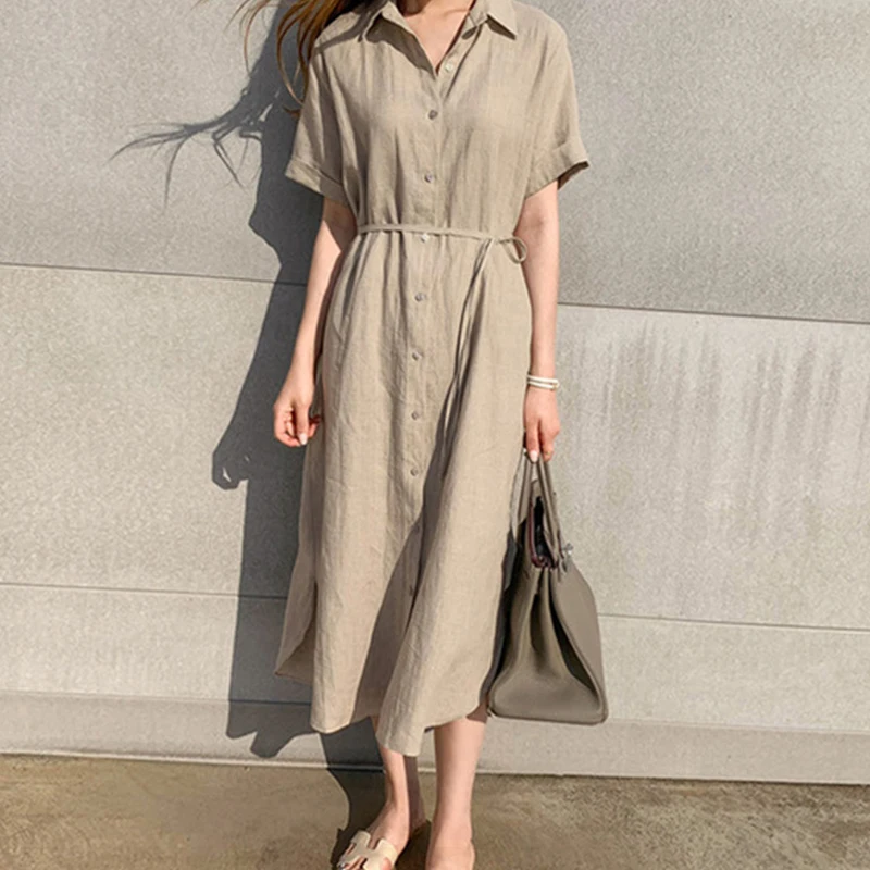 Women’s Cotton Linen Shirt Dress – Summer Short Sleeve, Turn-down Collar, Loose Commuting Long Cardigan Dress